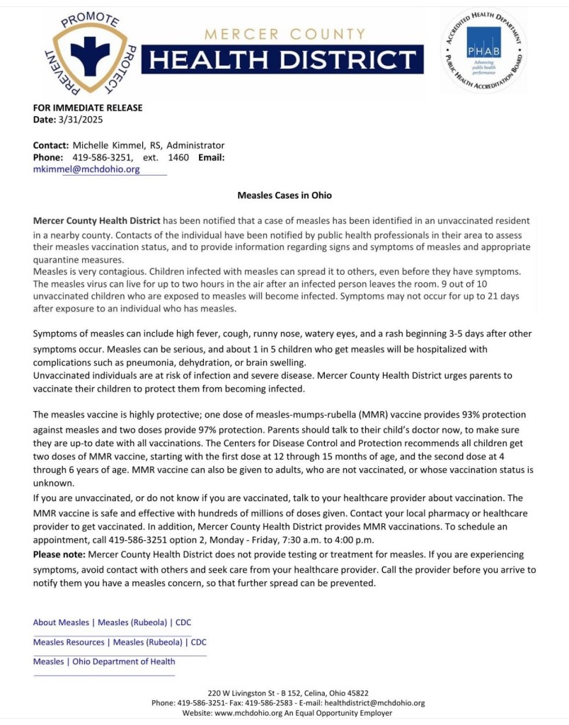 (3-31-25) The Mercer County Health District issued a statement on the US outbreak of measles.