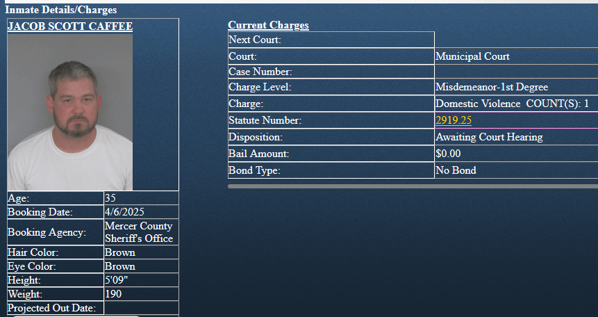 (4-7-25) Jacob Caffee (35) of Willshire was arrested yesterday on a 1st degree misdemeanor of domestic violence.