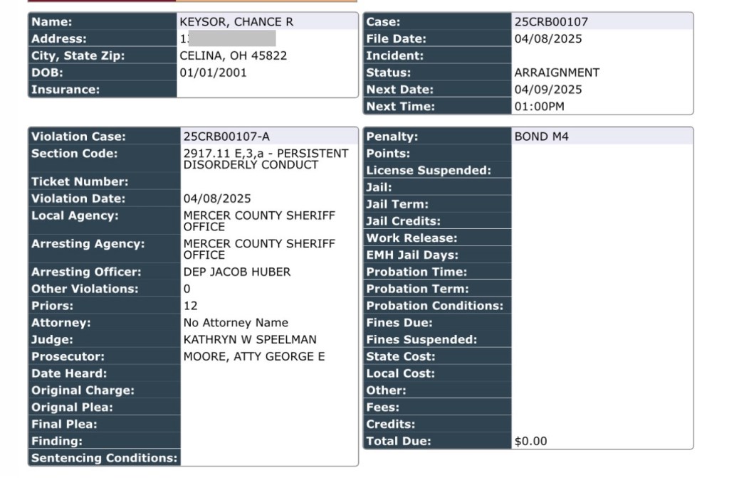 (4-8-25) Chance Keysor (24) of Celina was booked today on a 4th degree misdemeanor of persistent disorderly conduct.