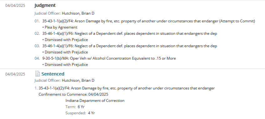(4-8-25) Julie E. Smith (39) of Celina, pleaded guilty in Jay Circuit Court to attempted arson, a Level 4 felony. She was sentenced to six years in Indiana Department of Correction with two years suspended and given credit for time served.