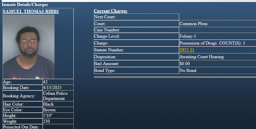 Samuel Bibbs (42) was arrested on a 5th degree felony of possession of drugs. He is being held at the Mercer County Adult Detention Center with no bond awaiting a Mercer County Common Pleas Court hearing.
