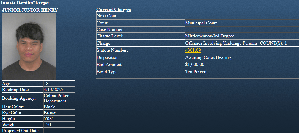 Junior Henry (18) was arrested on a 3rd degree misdemeanor of offenses involving underage minor. He is being held on a $1,000 (10%0 bond and is awaiting a Celina Municipal Court hearing.