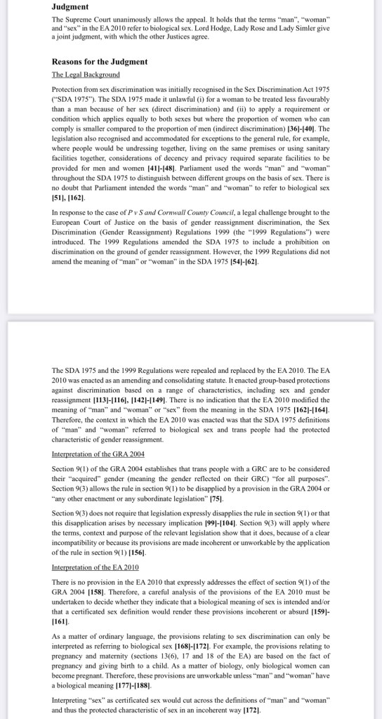 The Supreme Court unanimously allows the appeal. It holds that the terms “man”, “woman” and “sex” in the EA 2010 refer to biological sex. Lord Hodge, Lady Rose and Lady Simler give a joint judgment, with which the other Justices agree.