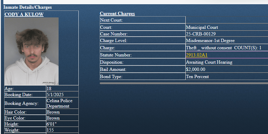 (5-1-25) Cody Kulow (18) was arrested yesterday on a 1st degree misdemeanor of theft, without consent.