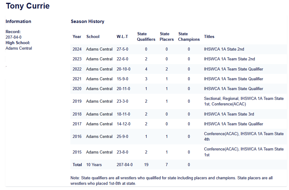 H was also a volunteer coach for four years before becoming an assistant. As a competitor he was a 3-time state qualifier and conference champion for Adams Central. He finished second his junior year and third his senior year. He also won the Ward E. Brown Mental Attitude award his senior year.