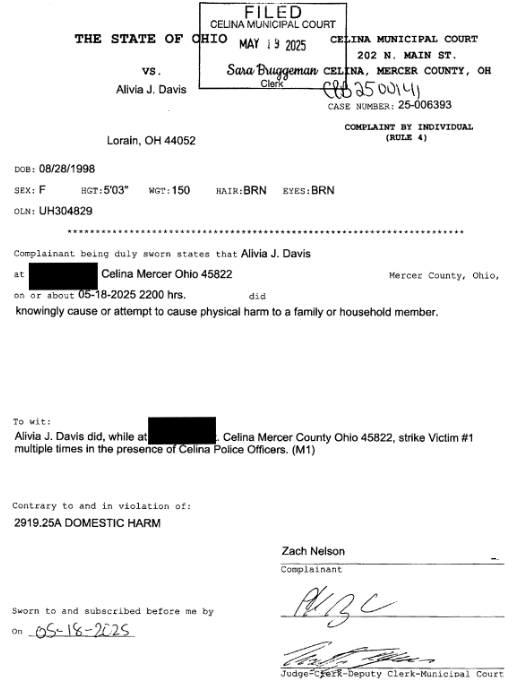 (5-19-25) On Saturday night, just after 10 pm, the Celina Police arrested former Celina resident Alivia Davis (26) of Lorain, Ohio on a 1st degree misdemeanor charge of domestic violence.