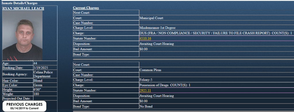 Ryan Leach (44) was arrested on a 1st degree charge of failure to file crash report and a 4th degree possession charge of drug possession. He is awaiting court hearing in Celina Municipal Court and Mercer County Common Pleas Court.