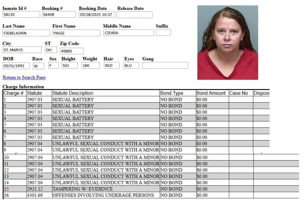 (5-28-25) Paige Fiebelkorn (33) of Wapakoneta was indicted by an Auglaize County Grand Jury on 16 charges, including unlawful sexual conduct with a minor, sexual battery, tampering with evidence and providing alcohol to a minor.
