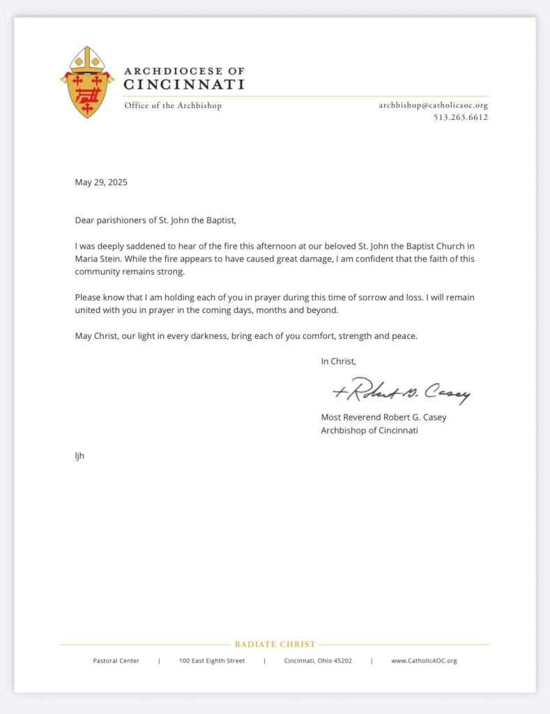 I was deeply saddened to hear of the fire this afternoon at our beloved St. John the Baptist Church in Maria Stein. While the fire appears to have caused great damage, I am confident that the faith of this community remains strong.