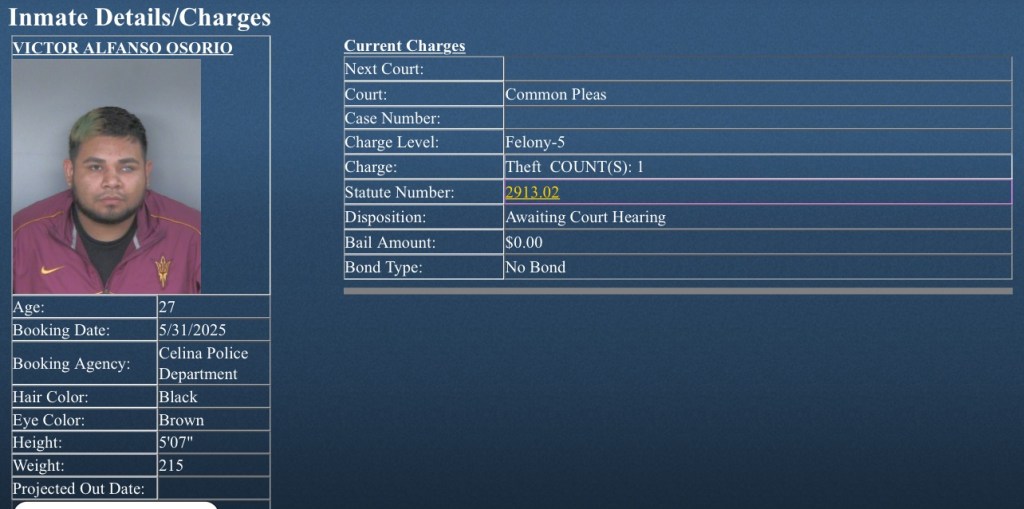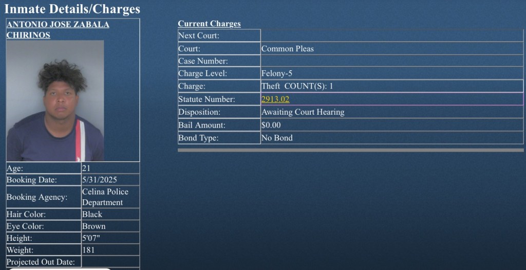 (6-1-25) The Celina Police arrested two men, Antonio Chirinos (21) and Victor Osorio (27) on 5th degree felony theft charges.