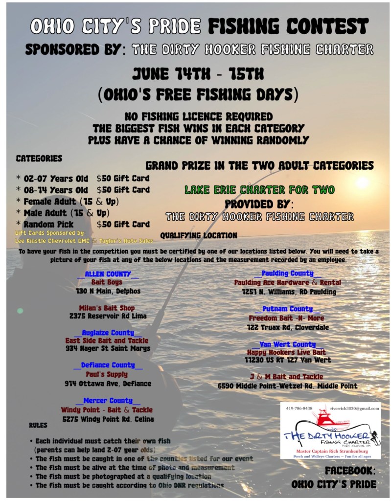 (6-2-25) Facebook’s Ohio City’s Pride is having their first annual “Ohio City’s Pride Fishing Contest” on June 14th-15th, during the * “Ohio ‘s Free Fishing Days”. The top two prizes in the male (15 and up) and female (15 and up) categories is a free fishing trip for two with “The Dirty Hooker Fishing Charters” on Lake Erie. There will also be prizes for Youth: 2-7, Youth: 8-14, and a random pick category. The biggest fish, by length, will be the winner in each category. You must take the fish to a qualifying location and have an employee measure your catch and then have a picture of your catch with the info and send it to Ohio City’s Pride with your name, phone number, location, species and length. All information that you provide will be for our record and will not be shared, except your first name and location of catch (unless asked not to post) and the species and length.
