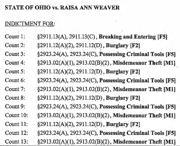 (6-6-25) Raisa Weaver (20) of Dunkirk (Ohio) was arrested on a 13-count indictment handed down by the Hardin County Grand Jury on May 21st.