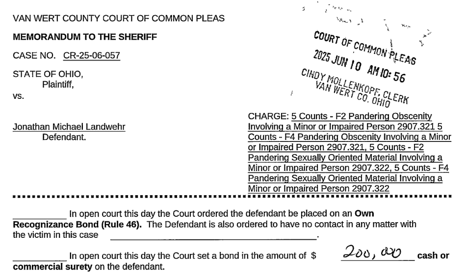 Landwehr is charged with 10 counts of pandering obscenity involving a minor or impaired person, all felonies of the second degree; and counts of pandering obscenity involving a minor or impaired person, each fourth-degree felonies. He was indicted on June 5th by Van Wert Common Pleas Grand Jury.