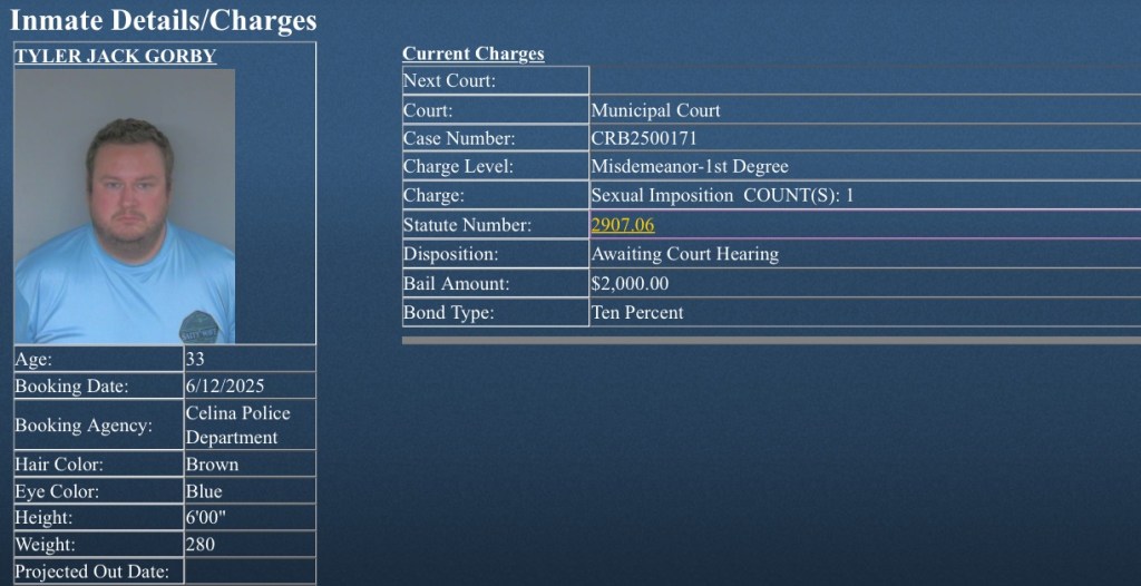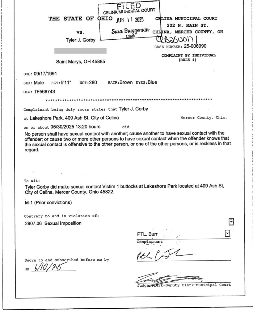 (6-12-25) Tyler Gorby (33) of St Marys has been charged with a 1st degree misdemeanor of sexual imposition. The incident happened at Lakeshore Park in Celina on May 30th.
