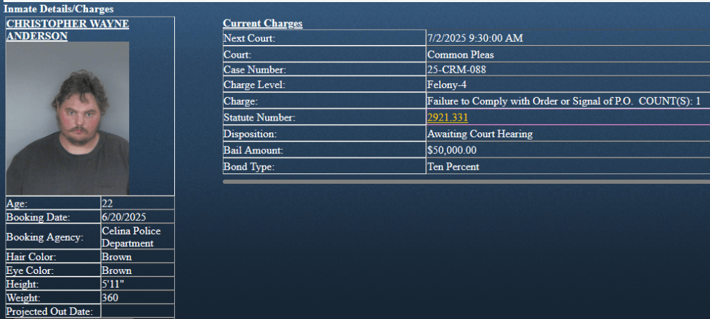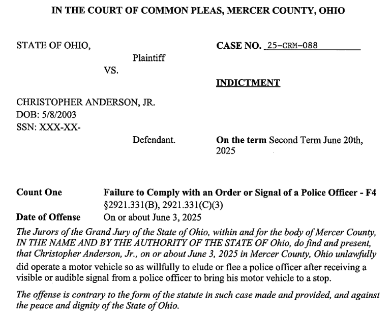 (6-24-25) Christopher Anderson, Jr (22) of Celina was indicted on June 20th on a 4th degree felony charge of failure to comply with an order or signal of a police officer on June 3rd.