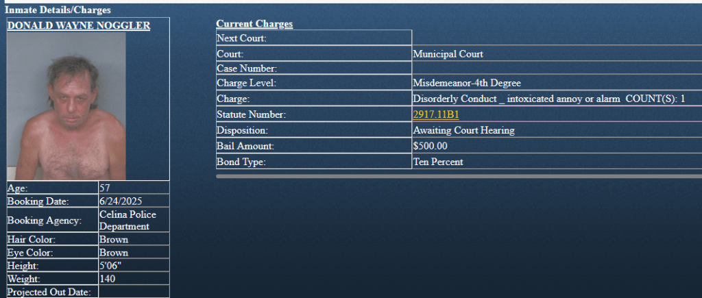 (6-25-25) Donald Noggler was arrested yesterday by Celina Police on a 4th degree misdemeanor charge of disorderly conduct, intoxicated annoy or alarm.