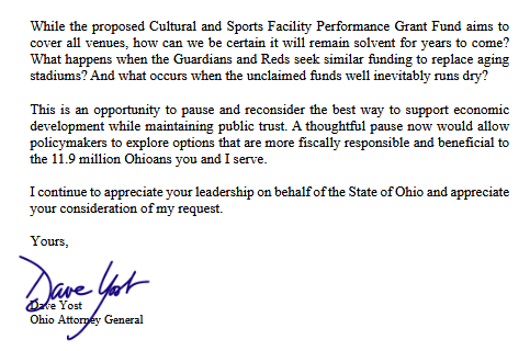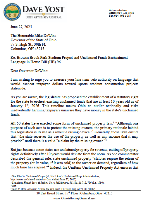 (COLUMBUS, Ohio) — Ohio Attorney General Dave Yost urges a veto to remove language from the pending state budget that would otherwise use taxpayers’ unclaimed funds for the Browns’ Brook Park Stadium Project.