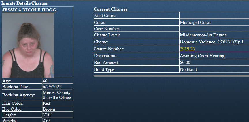 (6-29-25) Jessica Hogg (40) of Celina was arrested today by the Mercer County Sheriff’s Office on a 1st degree misdemeanor charge of domestic violence.