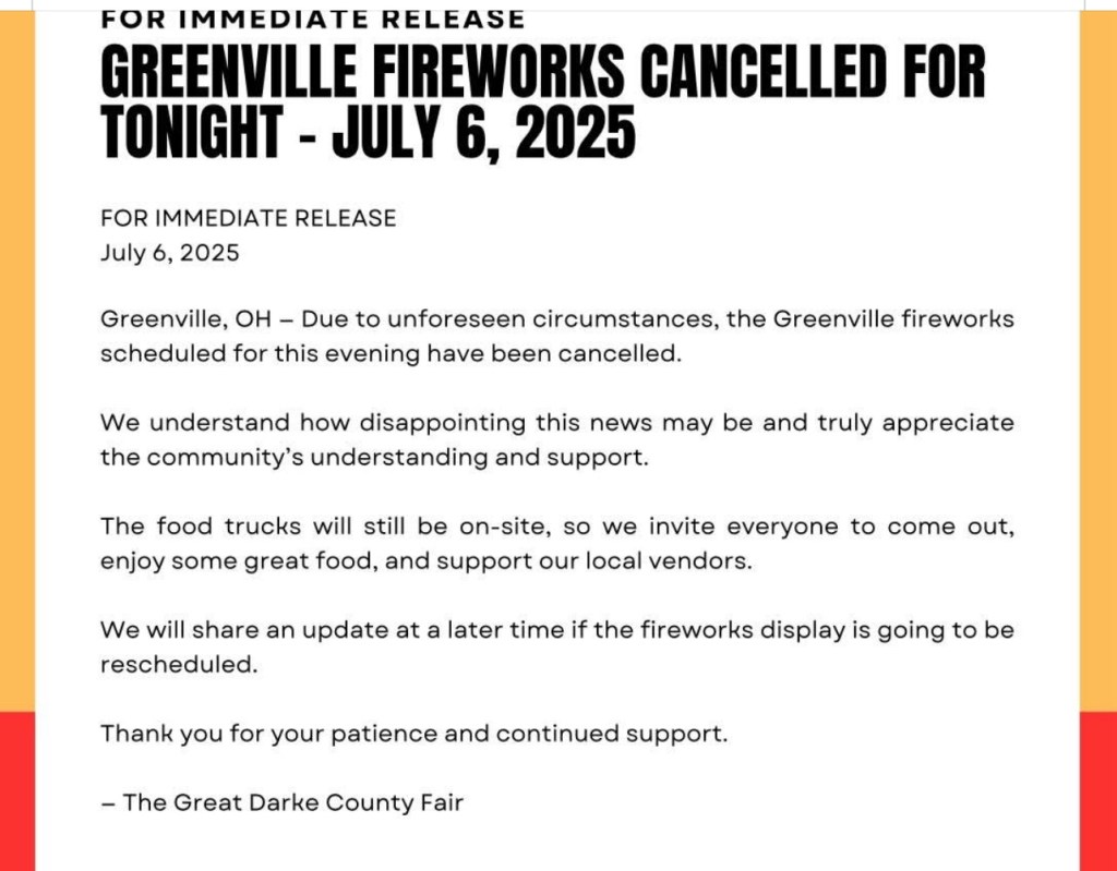 (7-6-25) Just released, fireworks scheduled for tonight at the Darke County Fairgrounds have been cancelled, no particular reason was given.