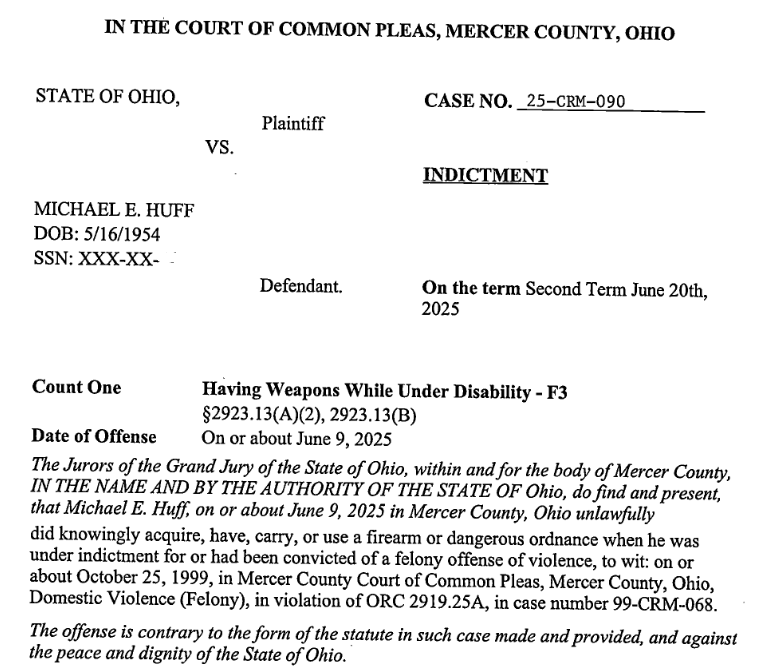 Michael Huff (71) Ft. Recovery was arrested on a 3rd degree felony having weapons under disability, under indictment convicted of felony He is awaiting a Mercer County Common Pleas Court hearing.