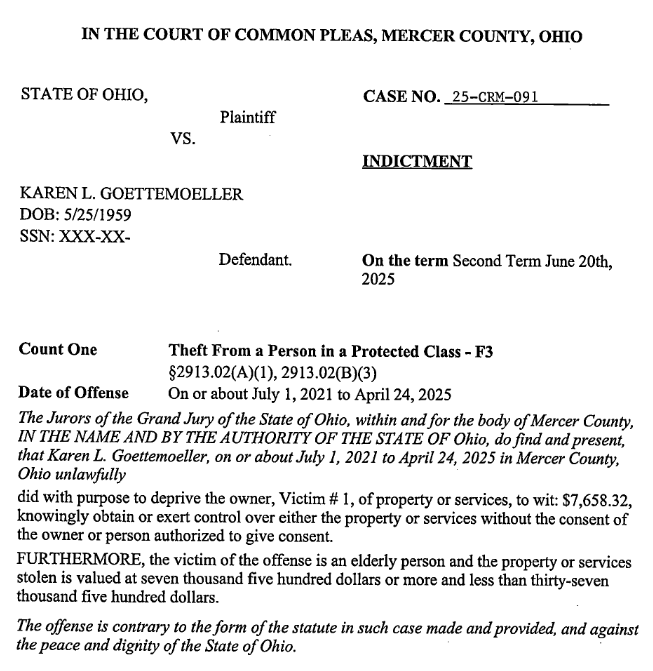 Karen Goettemoeller (66) of Celina was arrested on a 3rd degree felony of theft without consent. She is awaiting a Mercer County Common Pleas Court hearing.