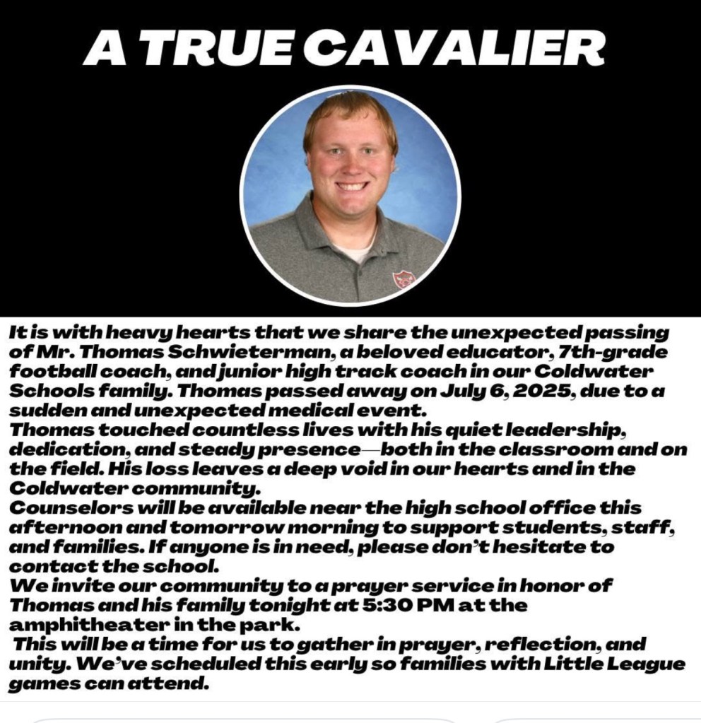Community, local news, Obituary Coldwater Teacher And Coach Passes Away From Sudden Medical Event Date: July 7, 2025Author: statelinesportsnetwork 0 Comments (7-7-25) Sad news from Coldwater Schools teacher and coach Tom Schwieterman passed away suddenly yesterday. Share this: Share on X (Opens in new window) X Share on Facebook (Opens in new window) Facebook Like Loading... Related