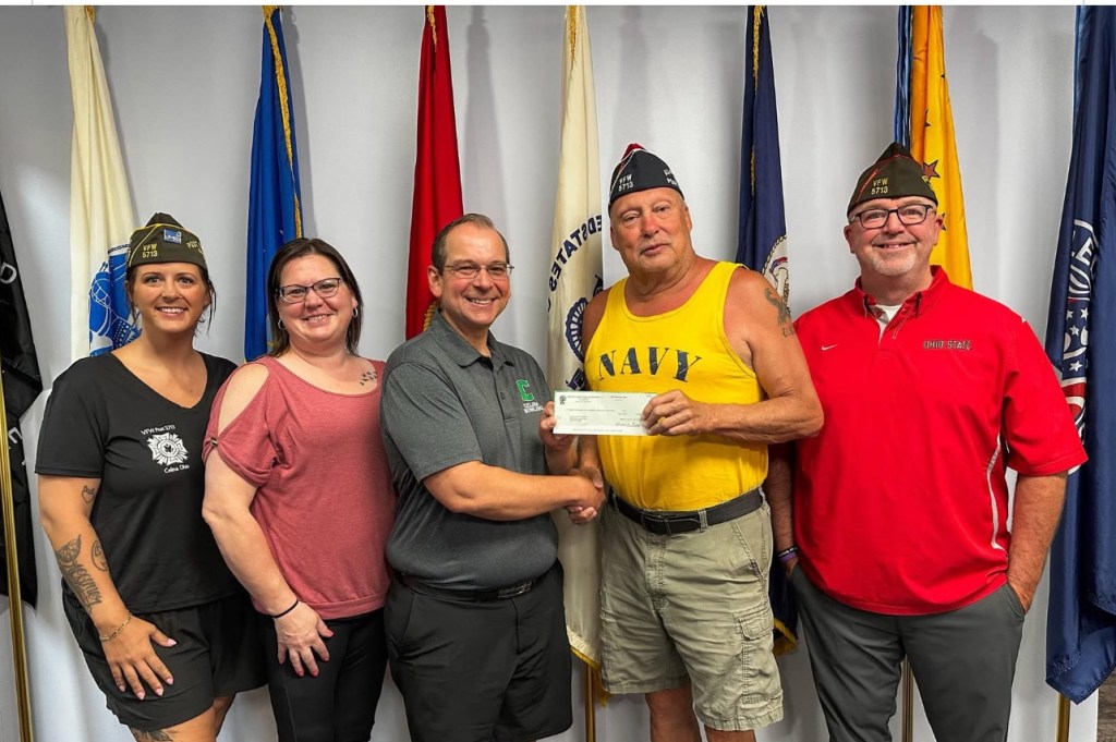 (7-22-25) VFW Post 5713 Quartermaster Jim Babcock, past commander Karl Hagaman, and Commander Paige Shivers presented Carl Huber & Sherri Black with a $3,200 check on behalf of Celina VFW Post 5713 to purchase a portable AED (Automated External Defibrillator).