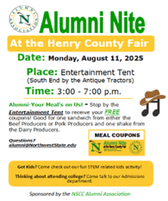 Archbold, Ohio (7-29-25) – Calling all Henry County NSCC alumni! The Northwest State Community College Alumni Association will host an “Alumni Nite” event at the Henry County Fair (Napoleon) for Henry County NSCC alumni. The event will take place in the Entertainment Tent (south end by the Antique Tractors) from 3:00-7:00 p.m. on Monday, August 11th.
