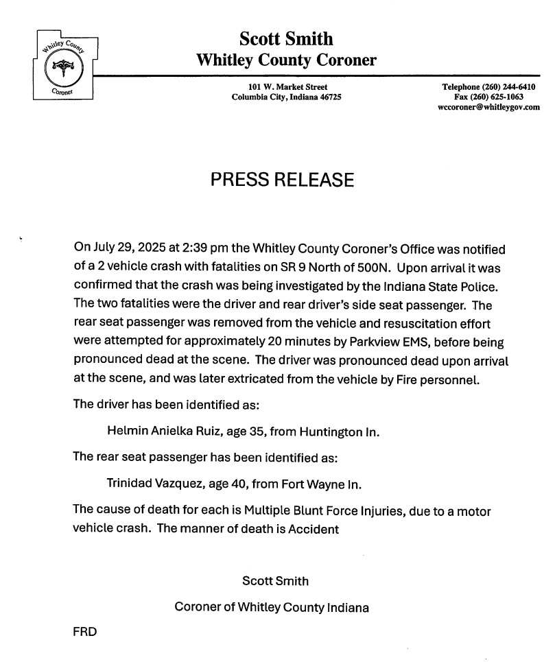 A preliminary investigation shows a blue 2012 Dodge Avenger passenger car carrying six people was traveling south on SR9 near CR 500N when for an unknown reason, it crossed over the center line into the northbound lane. After crossing the center line, the car hit a black 2019 Ford F-350 pickup truck and trailer that was in the northbound lane. The 2019 Ford was driven by JD Fishburn (51) of Columbia City. The driver of the blue Dodge, Helmin Ruiz (17) of Huntington, has been identified by the Whitley County Coroner as one of the deceased. A passenger of the blue Dodge Avenger who did not survive the crash has also been identified by the Whitley County Coroner as Trinidad Vasquez (40) of Fort Wayne. The family of Helmin Ruiz and Trinidad Vasquez have been notified.