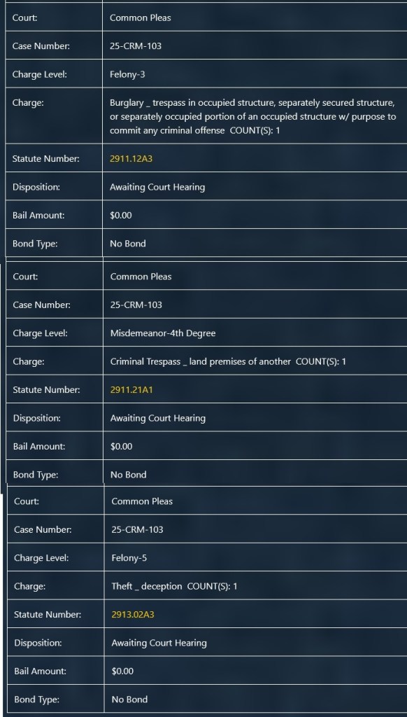 (8-5-25) Dustin Garmon (39) of Muncie was booked by the Mercer County Sheriff’s Department on a felony 3rd degree burglary charge, 5th degree of theft deception and a 4th degree misdemeanor of criminal trespass charge.