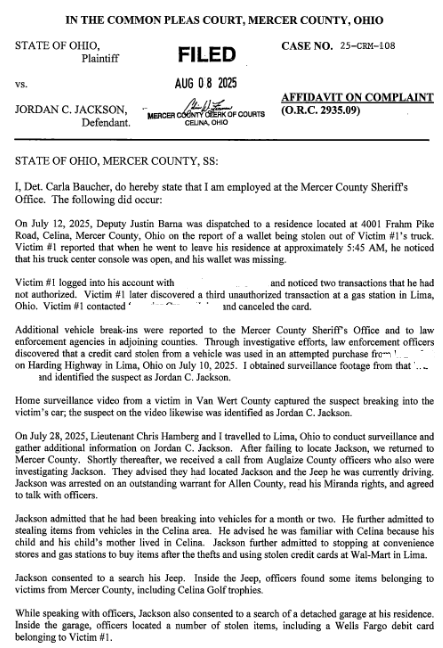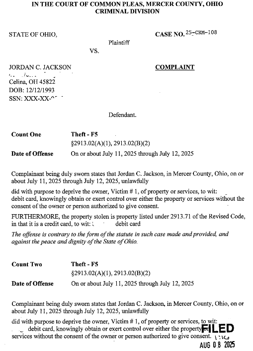 (8-13-25) Jordan Jackson (31) of Celina was arrested on two 5th degree felony counts of theft. The incidents took place on July 11th/12th.