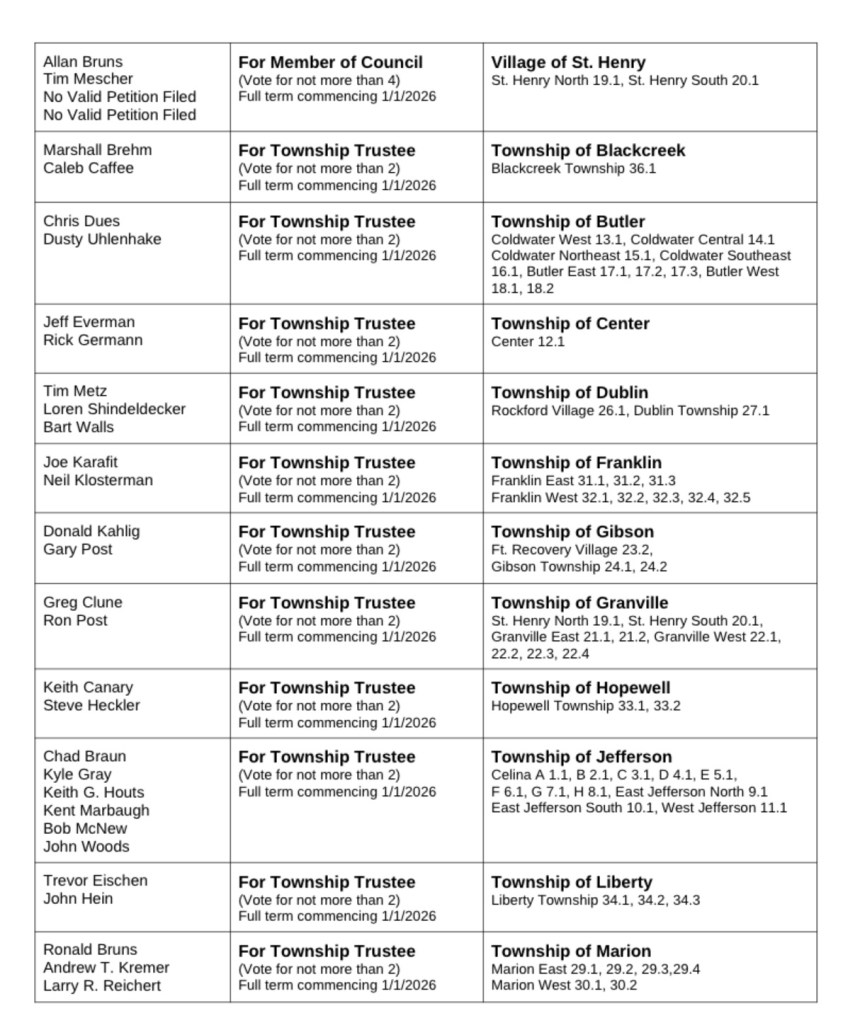 At Monday’s board meeting, the village, township, ESC and school board candidates were certified, along with the levies and one write-in for Washington Township Trustee. The City of Celina candidates were previously certified.