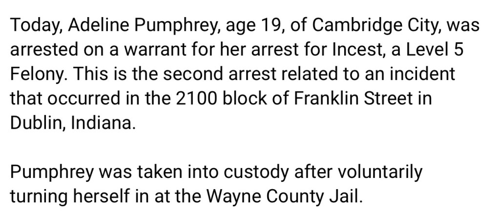Adeline Pumphrey (19) of Dublin, Indiana was booked by the Mercer County Sheriff’s Office on a DUI charge and is being held in the Mercer County Adult Detention Center on $2,000 (10%) bond.