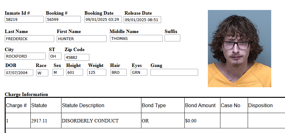 (9-1-25) Hunter Frederick (21) of Rockford was arrested on a disorderly conduct charge. After being booked into the Auglaize County Jail he was released on his own recognizance.