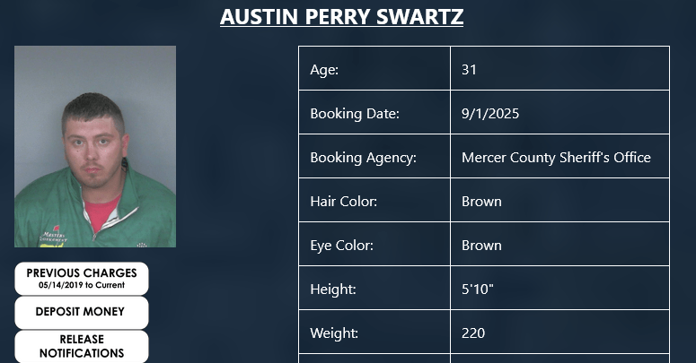 (9-2-25) Austin Swartz (31) of Celina was booked yesterday by the Mercer County Sheriff’s Office on a 3rd degree having weapons while under disability, drug related Condition, a 5th degree felony of possession of drugs, obtain possess or use and a 4th degree misdemanor of illegal use or possession of drug paraphenalia.