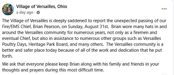 (9-3-25) The village of Versailles shared the sad news of the unexpected death of its Fire and EMS Chief, Brian Pearson (49) , on Sunday, August 31 when he passed away in the ER at Wayne HealthCare in Greenville.
