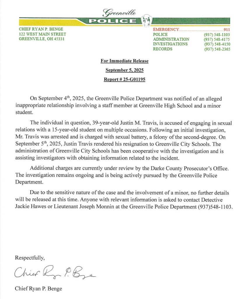 Travis is a staff member at Greenville High School and was an arrested on a 2nd degree felony charge of sexual battery with a 15 year old student on multiple occasions. He resigned today from his position at the school.