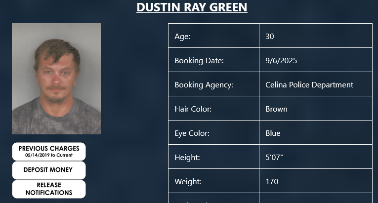Dustin Green (30) of Celina was booked by the Celina Police Department on two first degree misdemeanors of falsification and and a 2nd degree misdemeanor of obstructing official business.