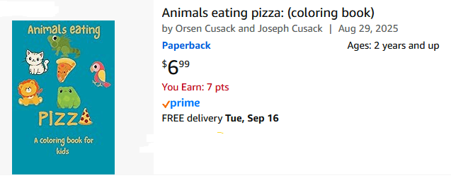 (9-13-25) Orsen Cusack, from Missouri, is in the 5th Grade and thanks to his dad Joe they have produced a coloring book ‘Animals Eating Pizza‘. Thanks to Amazon it is available online.