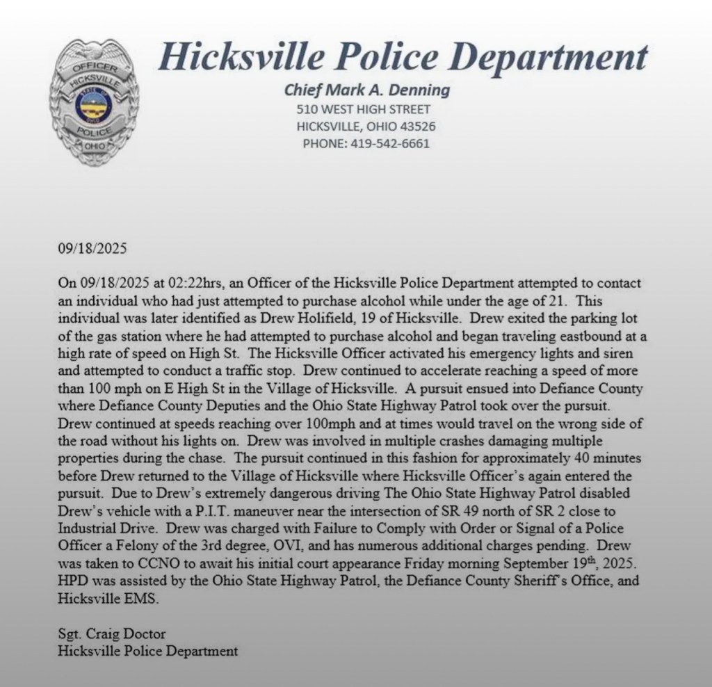 (9-18-25) Drew Holyfield (19) of Hicksville is facing multiple criminal charges, including felony failure to comply and operating a vehicle while intoxicated, after Hicksville Police say he led them on a 40-minute chase early Thursday morning just before 2:30 a.m. Holifield had tried to buy alcohol at a gas station.