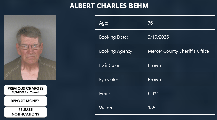 (9-20-25) Albert Behm (76) of Celina has been charged with three 2nd degree felony counts of pandering sexually oriented material involving a minor and one 2nd degree felony count of the illegal use of a minor in nudity oriented material or performance.