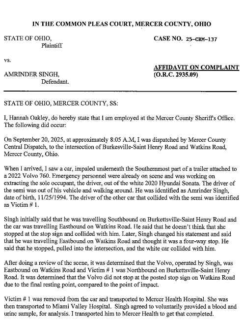 (9-20-25) Amrinder Singh (30) of Bakersfield, California was booked today by the Mercer County Sheriff’s Office on a 3rd degree felony of aggravated vehicular assault, vehicular assault.
