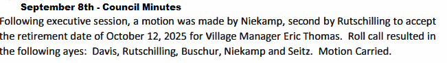 Eyink will replace long-time village manager Eric Thomas, who held the position for 23 years, he recently submitted his letter of retirement, that will become effective on October 12th.