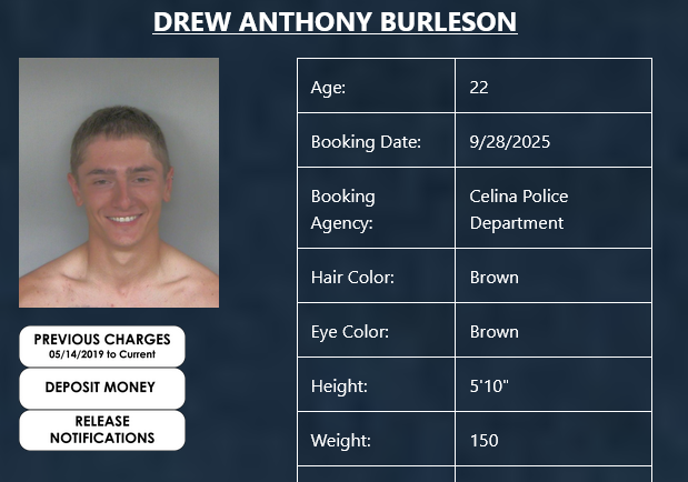 (9-28-25) Drew Burleson (22) of Celina was booked yesterday by Celina Police on multiple charges.