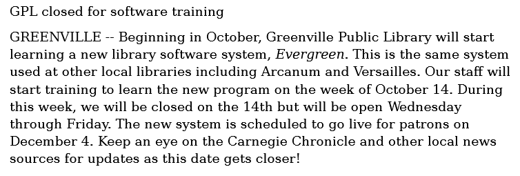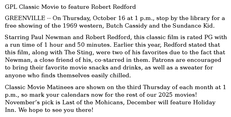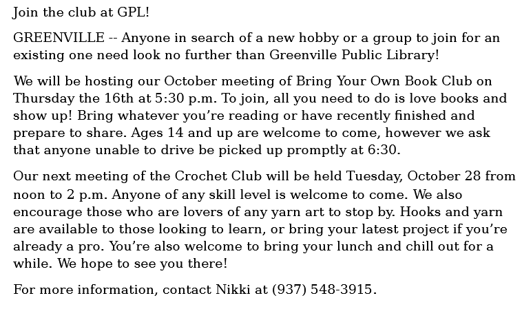 (10-1-25) Another busy month in October for the Greenville Public Library.
