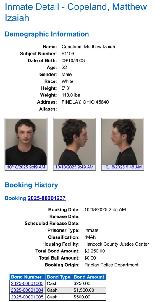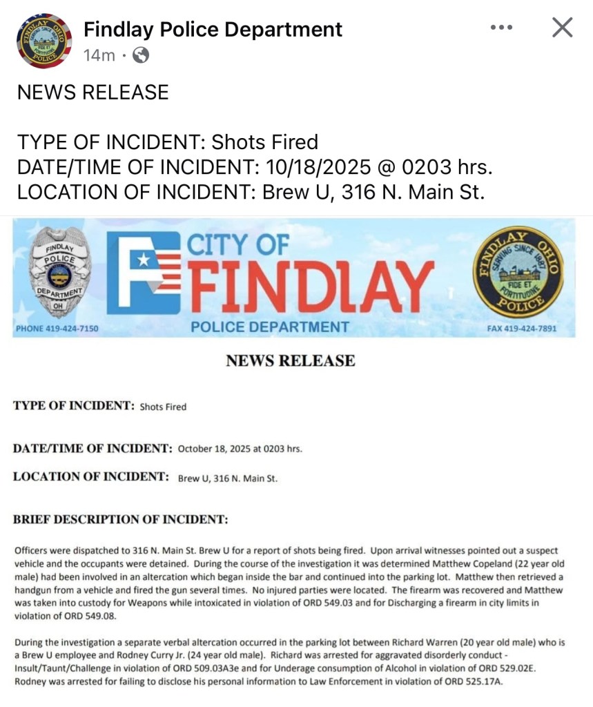Arrests, Regional Shots Fired Incident In Findlay Date: October 18, 2025Author: statelinesportsnetwork 0 Comments (10-18-25) Shots fired early this morning at Brew U in Findlay. While the shooting was being investigated by Findlay Police a verbal altercation broke out in a separate incident. Share this: Click to share on X (Opens in new window) X Click to share on Facebook (Opens in new window) Facebook Like Loading... Related