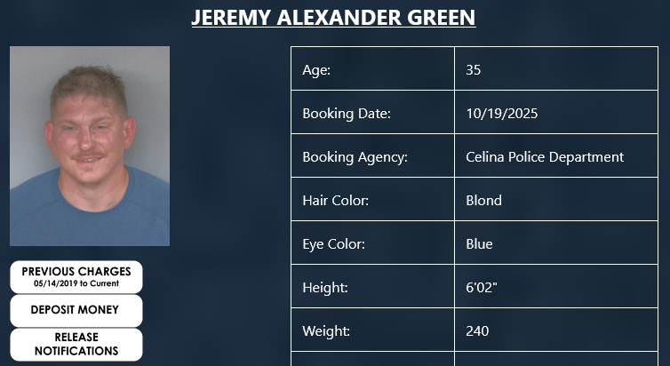 Jeremy Green (35) of Celina was booked by the Celina Police Department on two charges…a 1st degree misdemeanor of assault, knowingly harm victim and a 1st degree domestic violence knowingly cause physical harm.