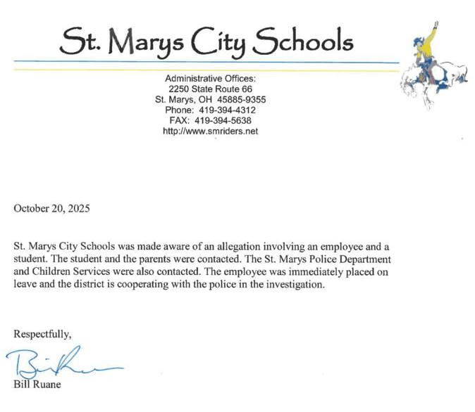 October 20, 2025 — St. Marys City Schools has placed another employee on leave following an allegation involving a student.