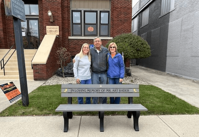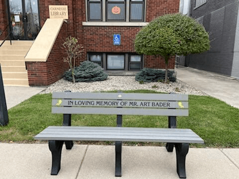 The bench was donated by the family and friends of Mr. Bader. Mr. Bader was a long-time educator and tutor, and he had served the library board of trustees for thirty years.