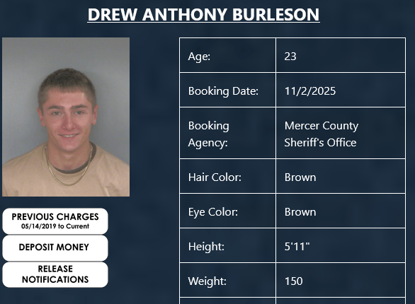 Drew Burleson (23) was booked by the Mercer County Sheriff’s Department on multiple charges.